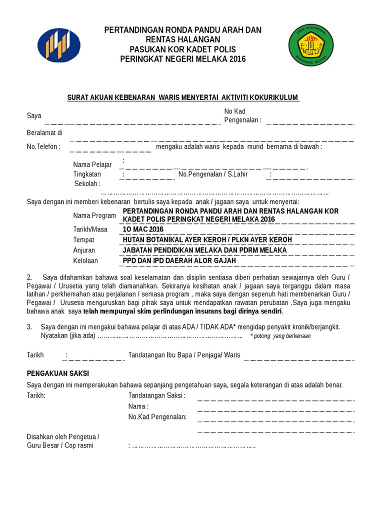 Jika ada sebarang pertanyaan, sila hubungi guru yang bertugas iaitu muhammad saifullah salleh no. Tuan/puan, kebenaran menyertai persatuan agama kristian smk_ saya *membenarkan/ tidak membenarkan, *anak / jagaan saya yang bernama _ no. Surat kebenaran ibu bapa kpm mp3 & mp4. Surat kebenaran ibu bapa/penjaga menyertai program anjuran kolej universiti islam melaka (kuim). Sekolah menengah kebangsaan durian daun, melaka.